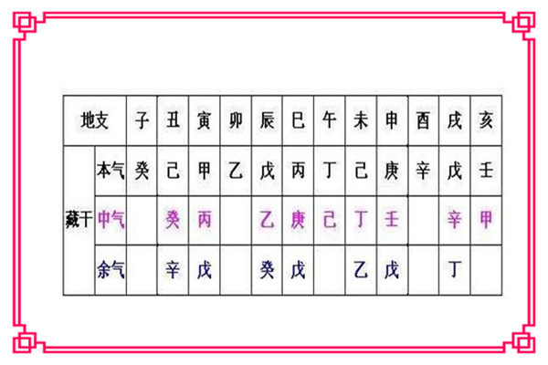 土行是一个季节的余气所归,故在土行的辰、戌、丑、未,中各加上面上面一个月地支的天干本气,如辰月虽属土,但仍有上面月余气乙木,故辰中藏有乙木。