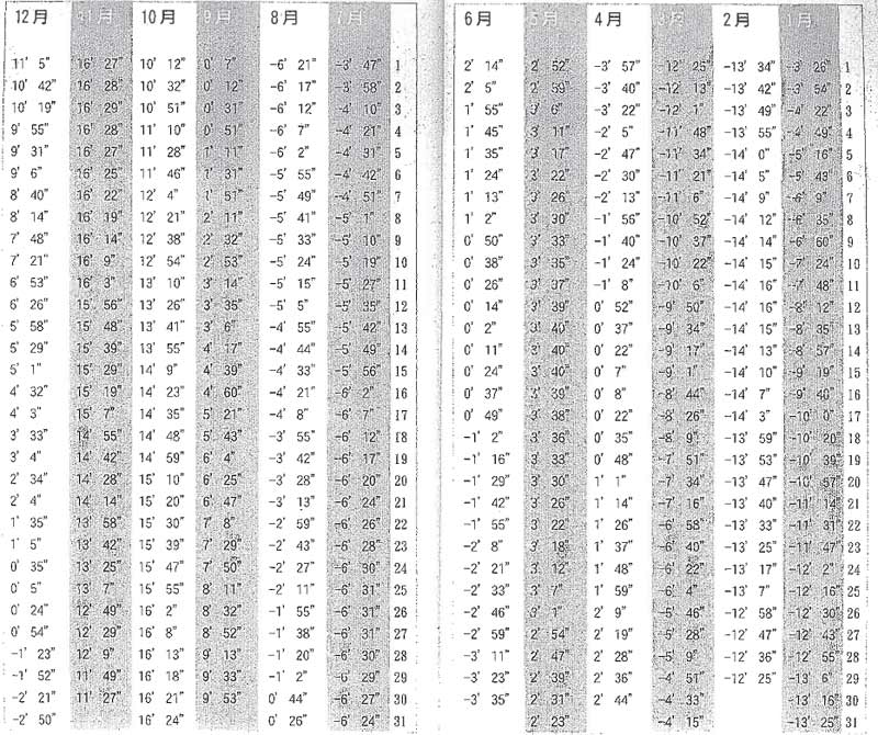 比如,十一月一日,在补偿表上对应的时间是16分27秒,则应在修正了经度时差的真太阳时上加上16分27秒;十二月三十一日对应的时间是-2分50秒,则应在修正了经度时差的真太阳时上减去2分50秒。
