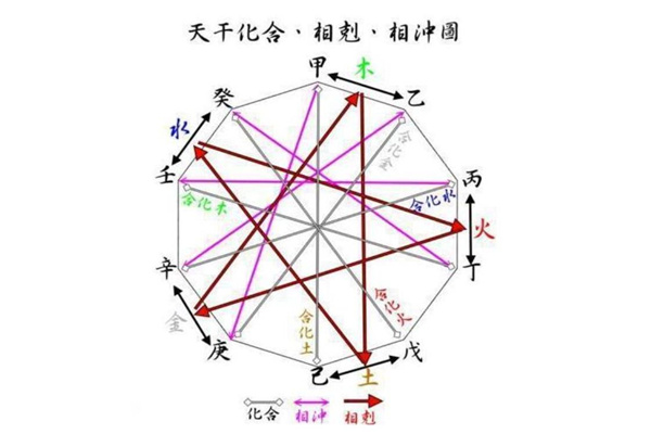 (2)十天干中,甲乙为东方木,庚辛为西方金,东西方向相对,故有甲庚相冲,乙辛相冲;丙丁为南方火,壬癸为北方水,南北方位相对,故有壬丙、丁癸冲。