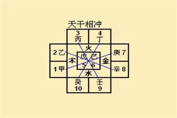 八字天干相冲的其实就是甲庚冲、乙辛冲、丁癸冲、壬丙冲,它们都在对应的五行属性上相冲,戊土和己土不参与相冲,因为土是万物的根源,方位也在正中,就不会相冲。