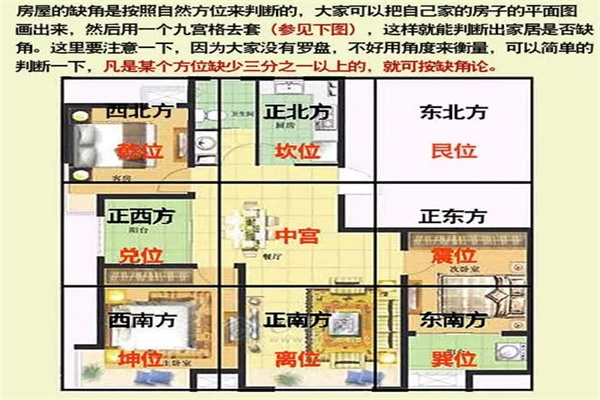 房屋缺角无非就是两种情况,住宅缺角或者凸角,屋宅缺角也就是,在住宅的某一个方位缺一块。