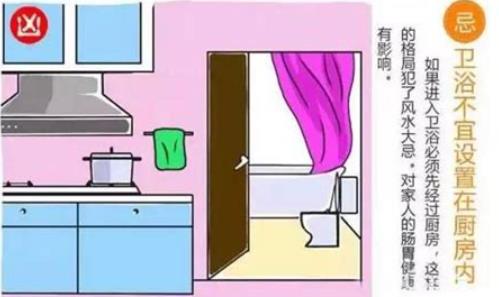 卫生间与厨房相连会形成“水火相冲”,不利于家庭和谐和健康。