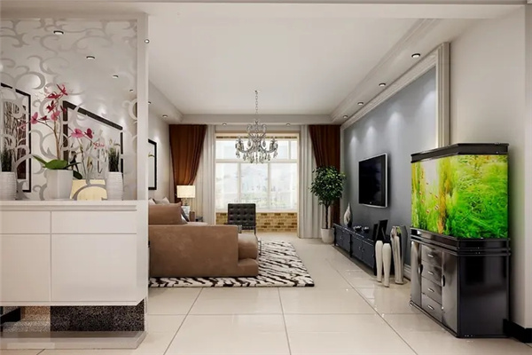 客厅是供主人和客人休息娱乐的场所,客厅的布置不宜过于复杂,主要采用比较高的组合柜放电视、音响、装饰物等,同时配合使用配有茶几的矮沙发,或者选用从天花板到地面的组合柜,博物架的上半部分可做成花墙,中间做成摆放古董、饰品的博物架,下面可做成装杂物的柜子,这样才符合“上虚下实”的风水原则。