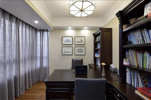 书桌一般都是和窗户成直角摆放的,这种角度比较适合自然光。除了利用自然光线之外,书房还要有整体照明的设施,以及在书桌上的辅助光源。辅助光源应该均匀地分布在桌面上,以便于主人阅读和查找书籍。