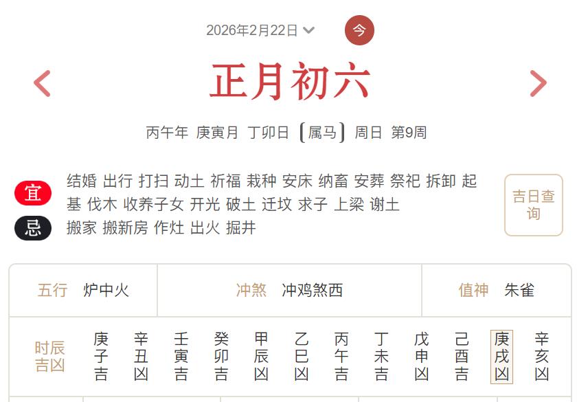 农历:二零二六年正月(大)初六