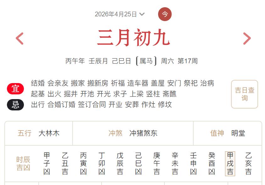 宜:结婚 会亲友 搬家 搬新房 祈福 造车器 盖屋 安门 祭祀 治病 起基 出火 掘井 开池 开光 求子 上梁 竖柱 斋醮