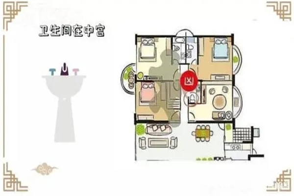 厕所是不能设置在房子中间位置的,中央属土,厕所属水。房屋的中心好比人的心脏一样,非常重要,厕所设置在房子中央,便显得不伦不类,非但有碍观瞻,而且有违风水之道。而且厕所是污秽之地,污秽之气就会到处蔓延,那么就会影响家人的运势和健康。