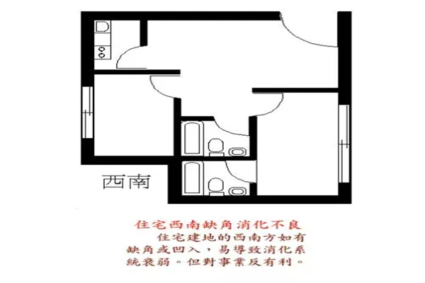 在风水中,昆宫位于西南部,代表着家庭中女主人的地位。如果在西南昆宫没有一个角落,对女性的健康,尤其是女主人的健康是有害的。”且不分性别,也会影响家庭的命运,造成家庭的抗逆力差和面对颓废抑郁的小小打击。