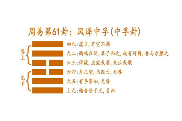 这个卦是异卦(下兑上巽)相叠,孚本义孵,孵卵出壳的日期非常准确,有信的意义。卦形外实内虚,喻心中诚信,所以称中孚卦,这是立身处世的根本,下面为大家介绍六十四卦:风泽中孚卦详解。