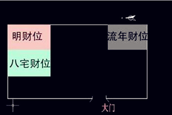 八宅派确定“财位”在生气方(就是最旺财之方向,数目大、且持久)、延年方(次旺财之方向,来的快、但数目与其生气方),天医方,(财运稳定,数目少量),之方向。如:震宅房屋的财位在东南巽宫和南方离宫,以及北方的坎宫。